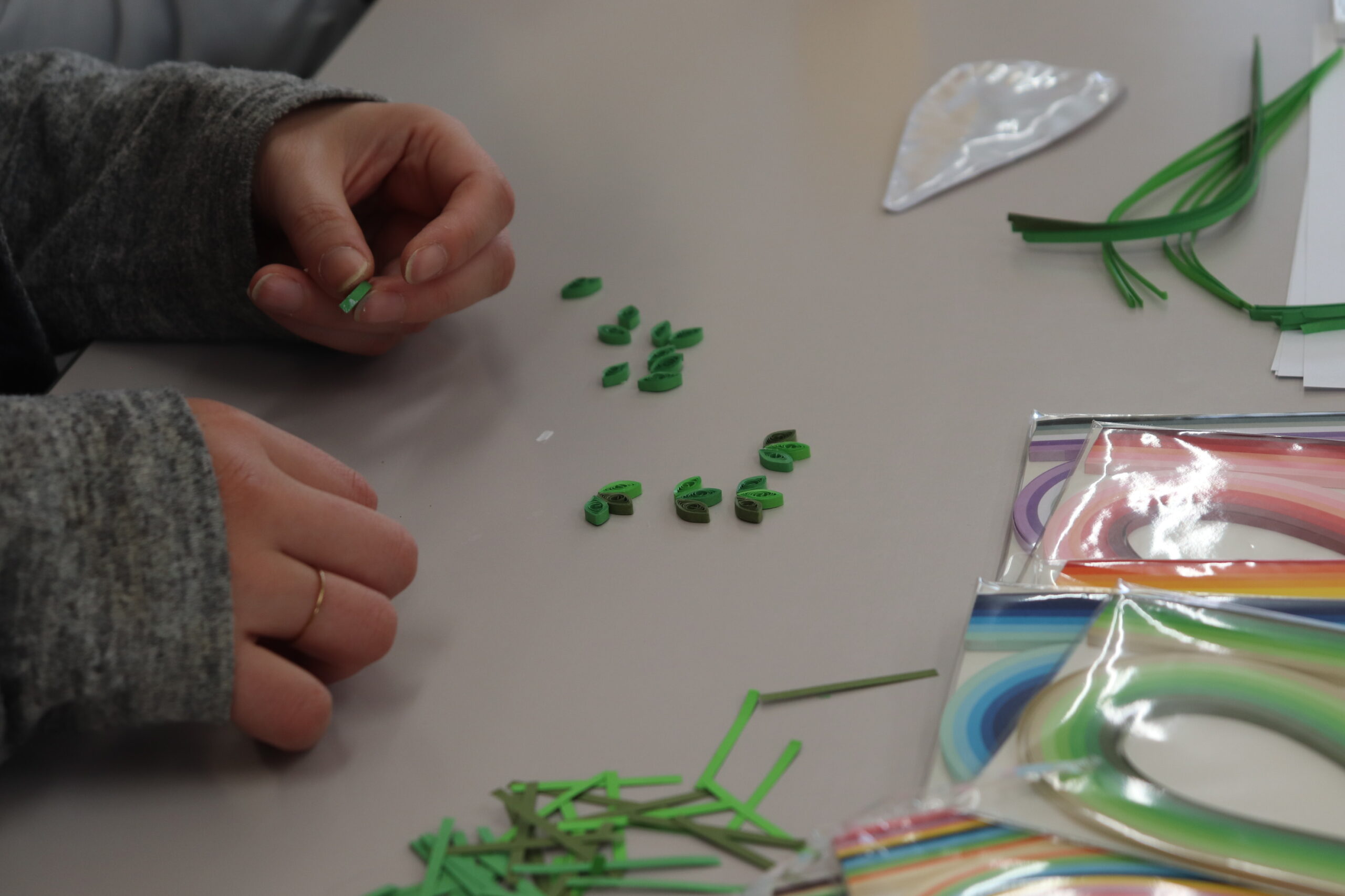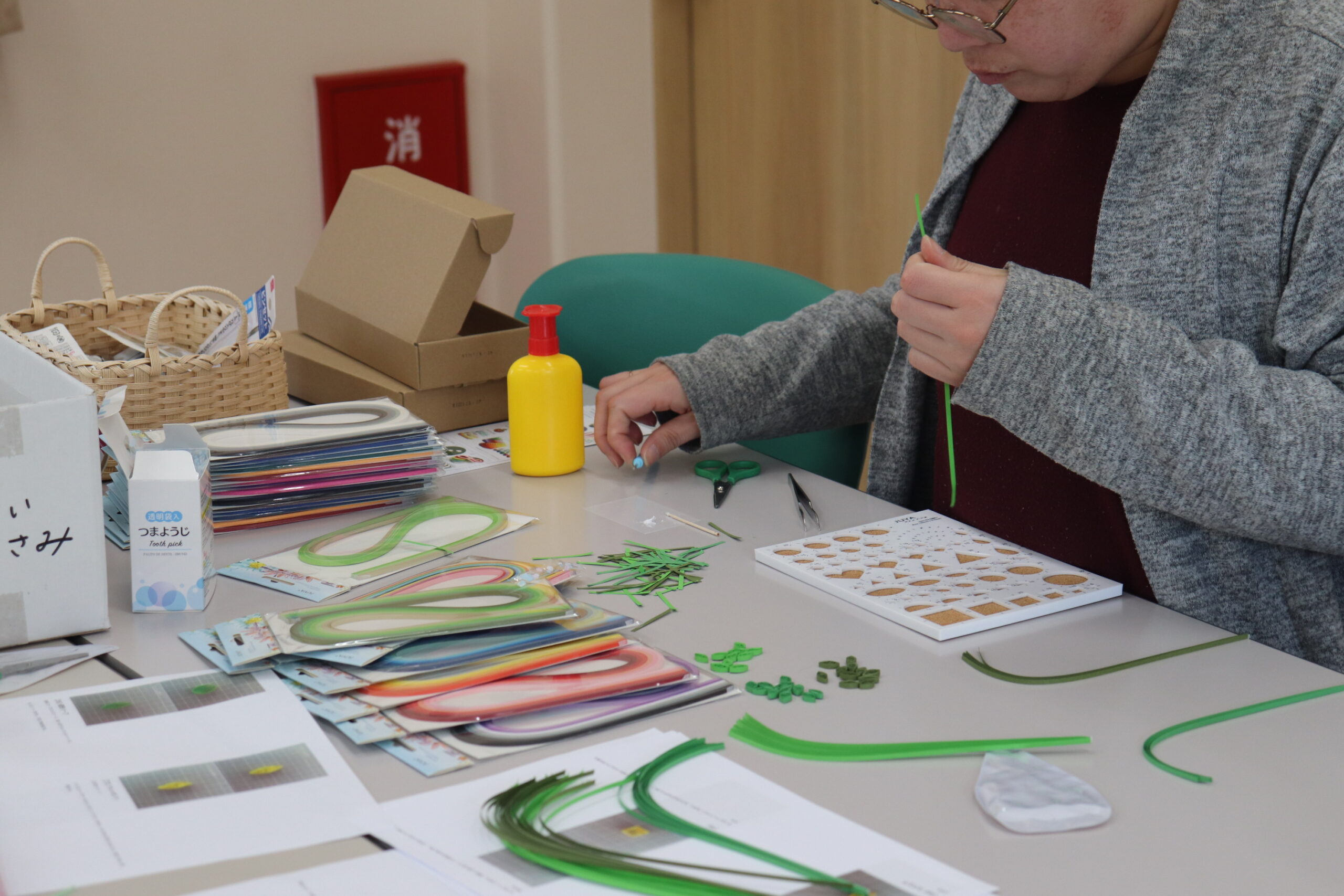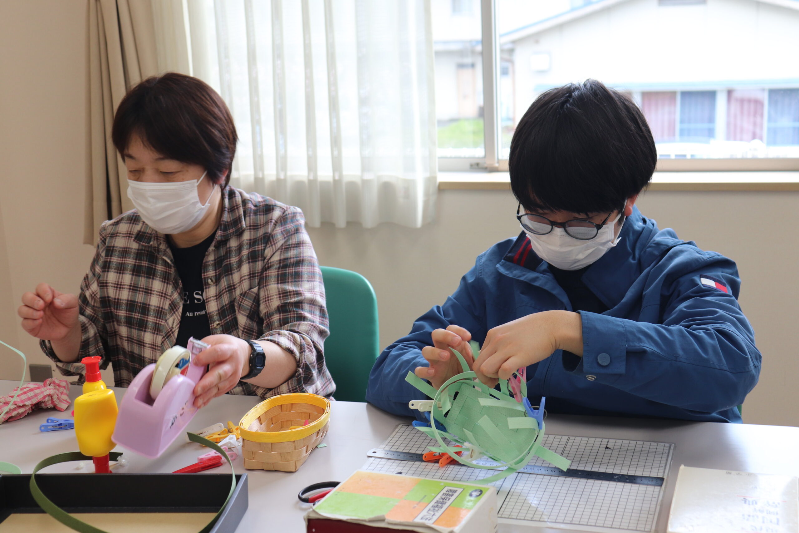 今回は、色鉛筆画・クラフトバンドのカゴ作り・クイリングアートの中から各々やってみたいものを選んで、取り組まれました。
