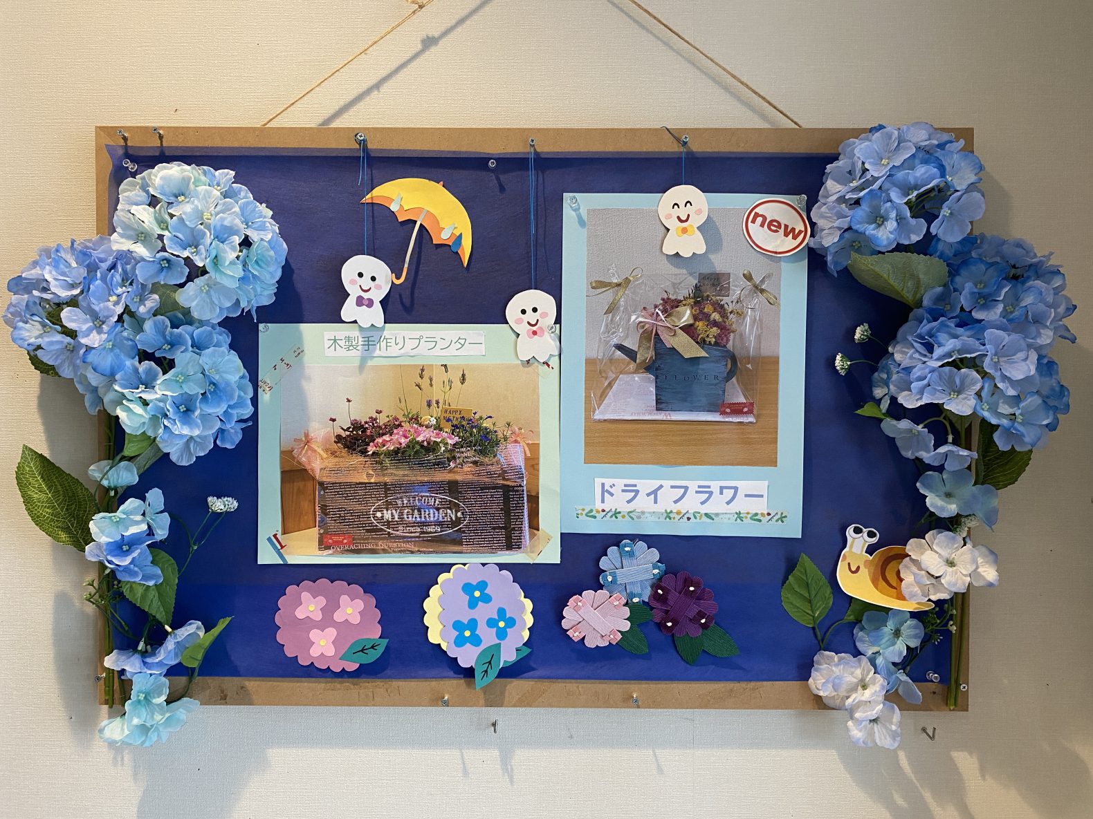 施設玄関のディスプレイを梅雨バージョンに変更しました。