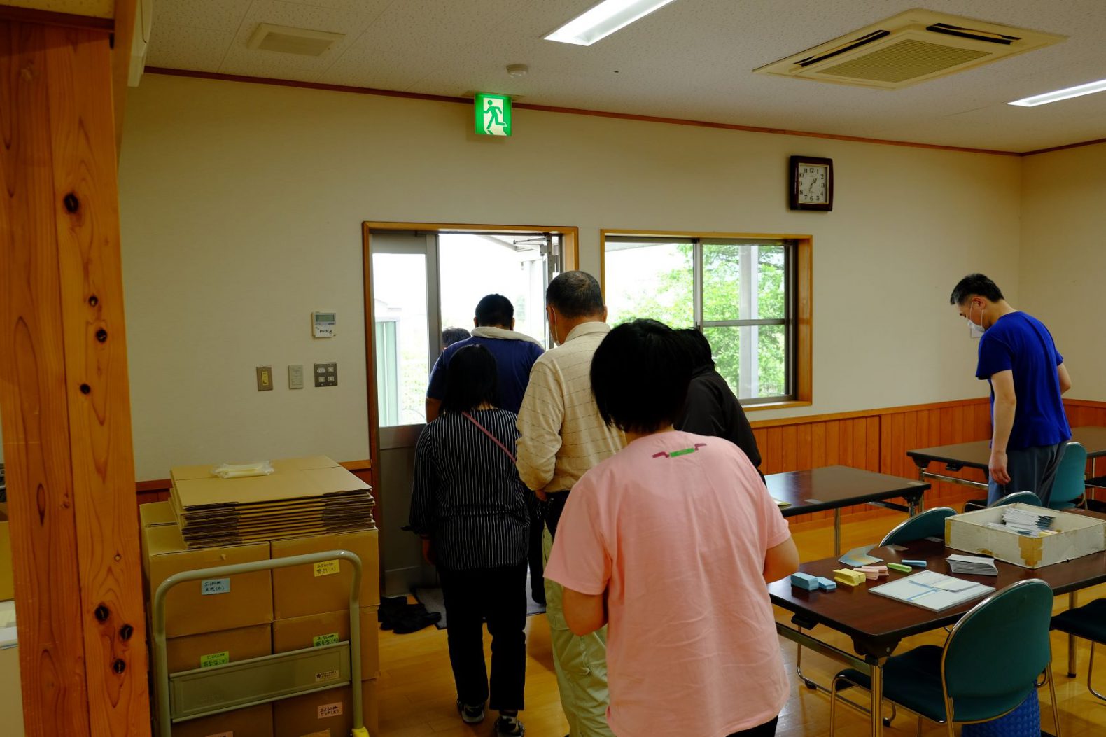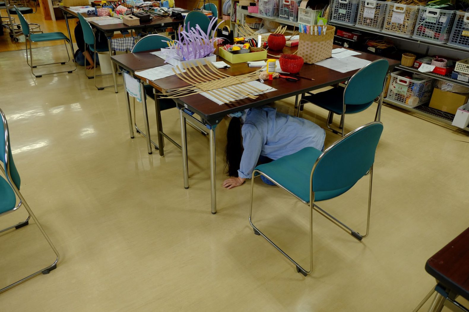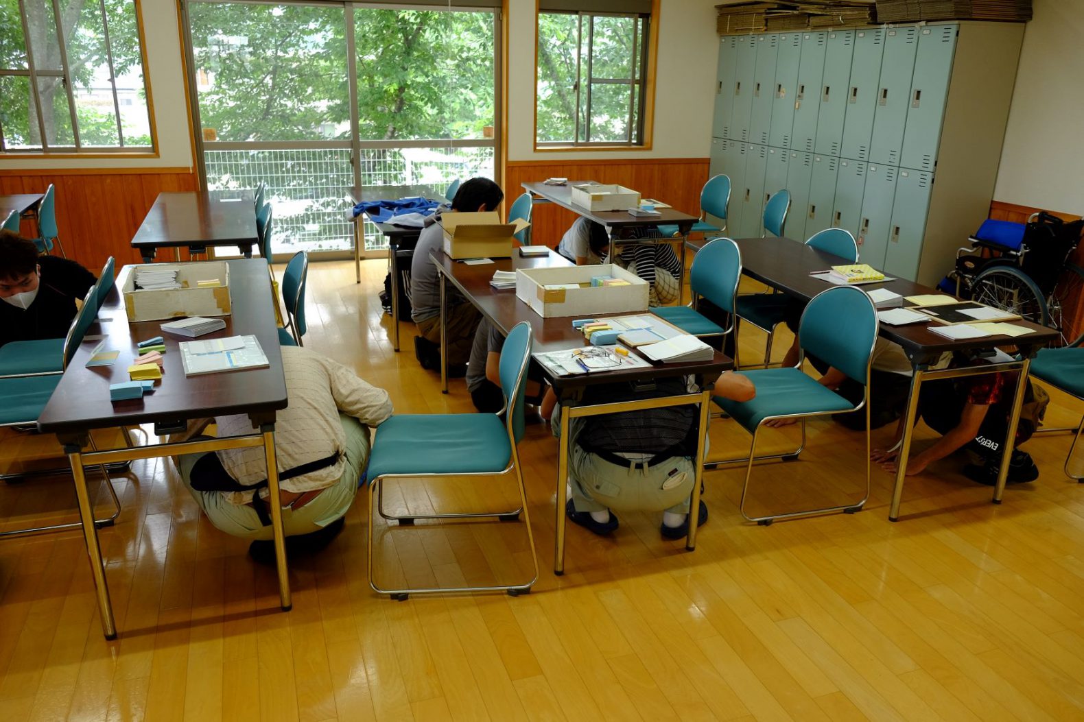 地震発生を想定した訓練で、皆さん、机の下に隠れた後、落ち着いて避難出来ていました。
