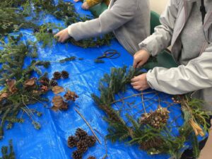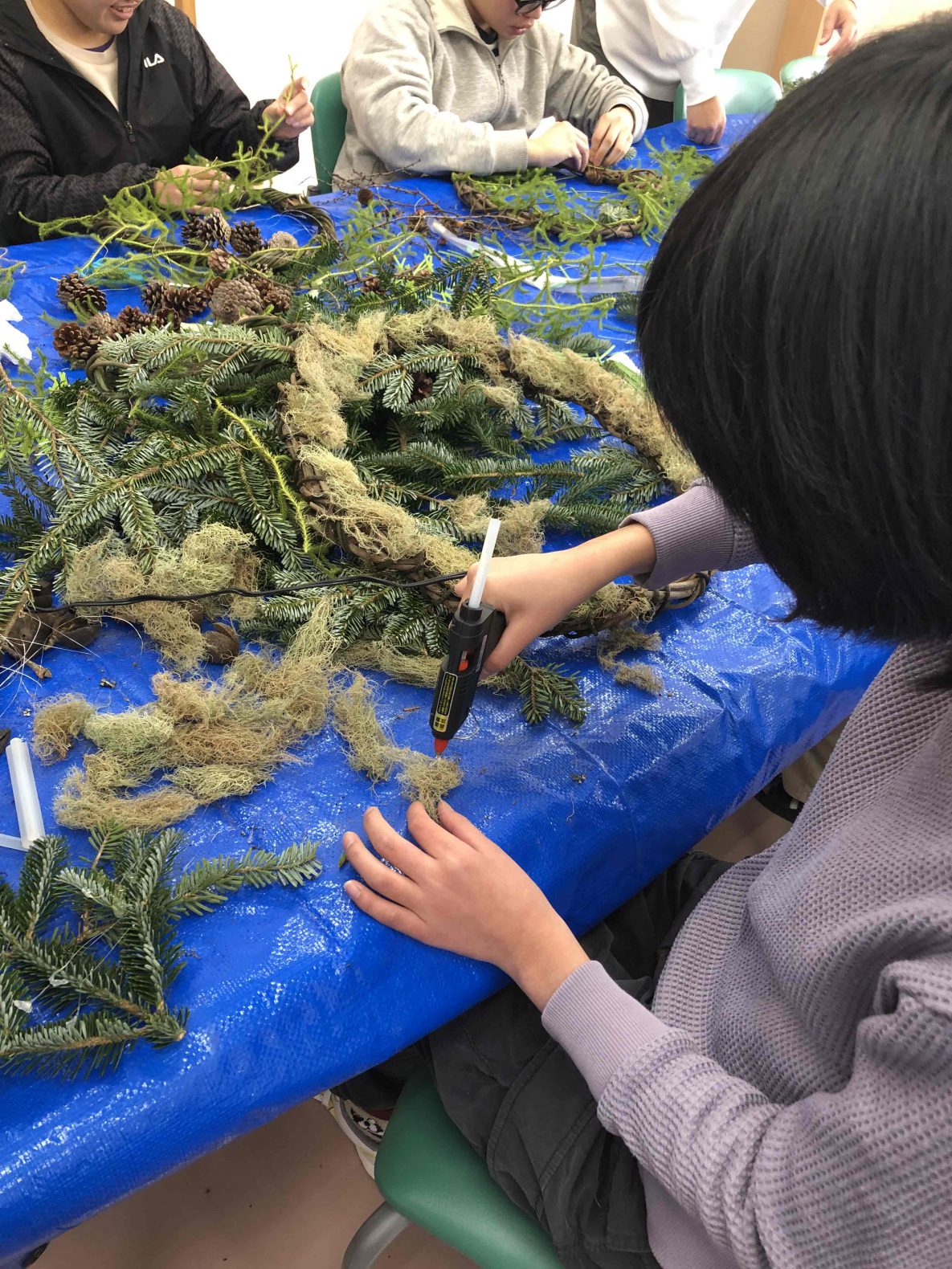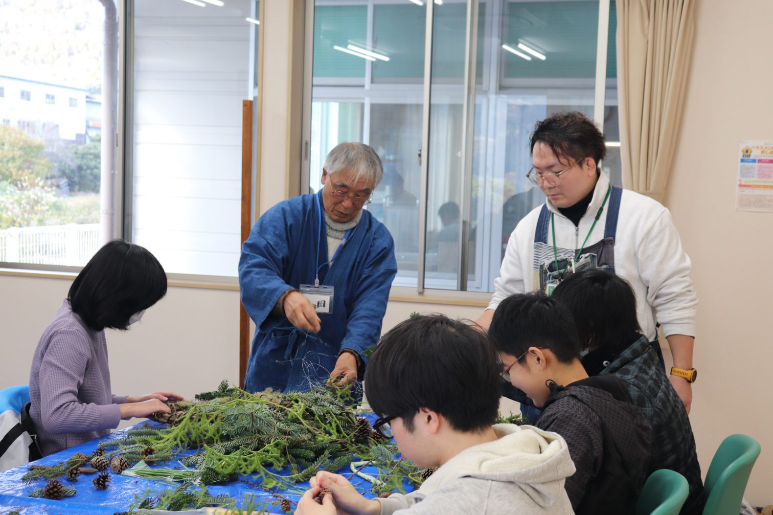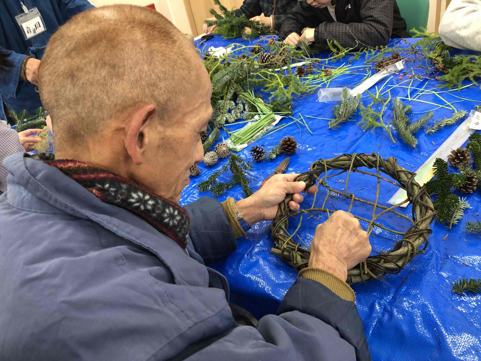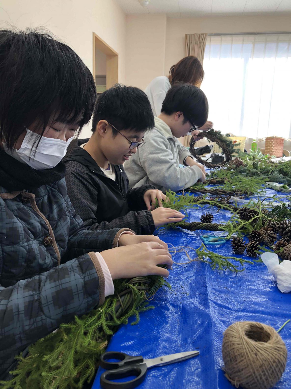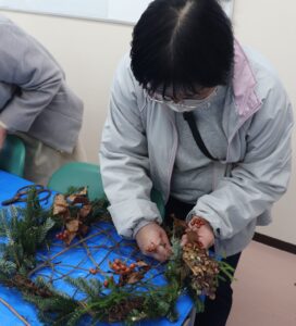 今回は精神保健ボランティアグループ「ハートみよし」の市岡氏が講師を引き受けてくださり、またボランティア2名の方も参加され、クリスマスリース作りをしました。