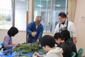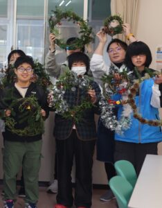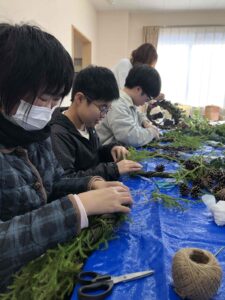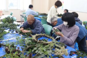 リースの材料は、本物のかずらやヒイラギ等自然の素材を市岡氏がすべて用意してくださいました。土台のリースも市岡氏が作成して下さっており、飾り付けをみなさん思い思いに付けられていました。それぞれ見事なリースを仕上げていて、みなさん大変楽しそうでした。
