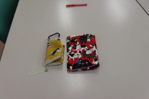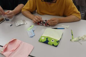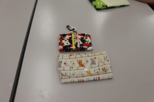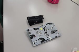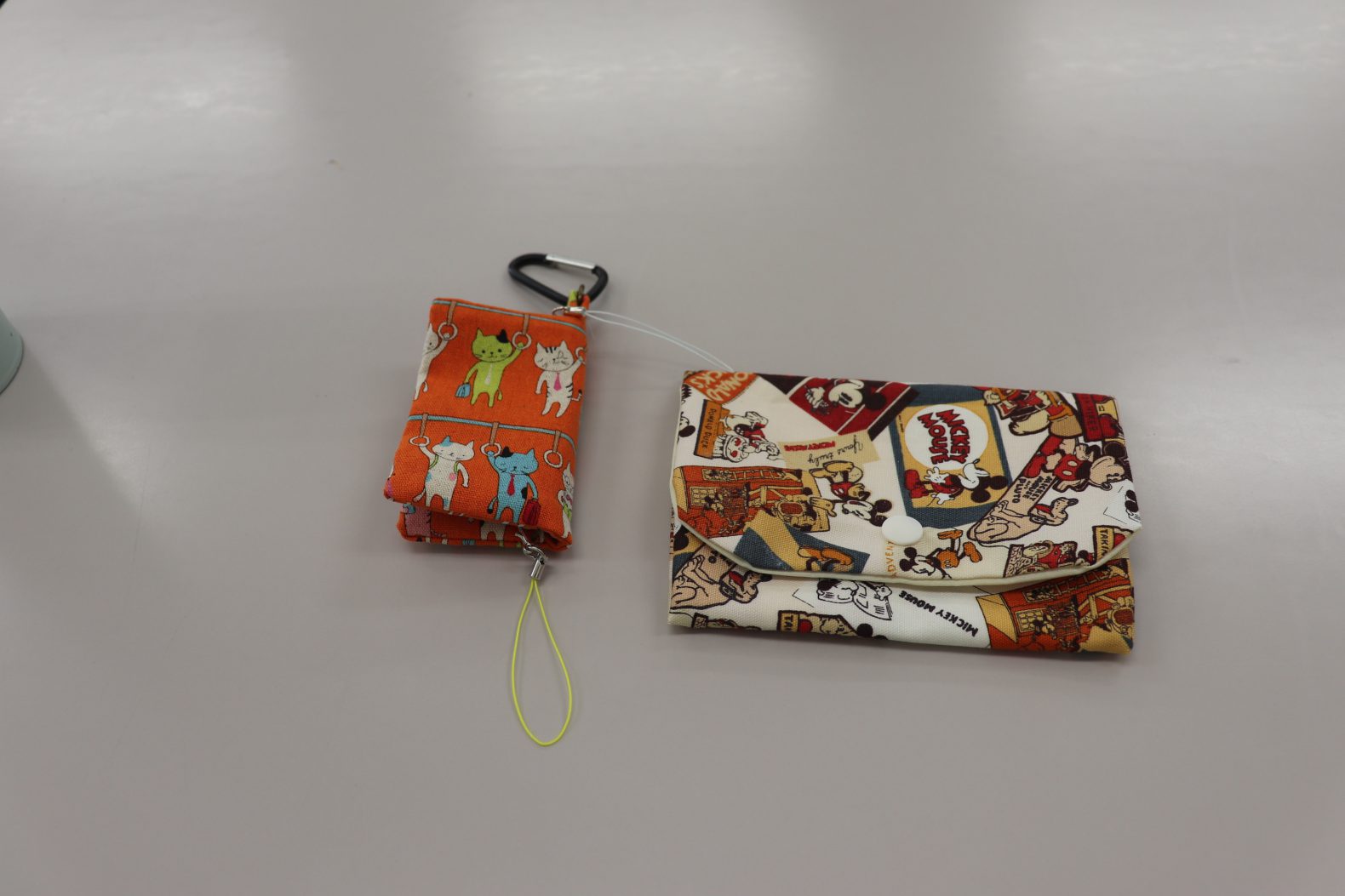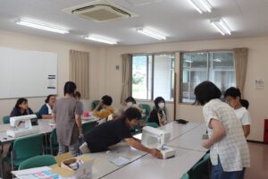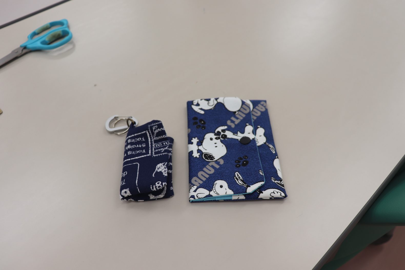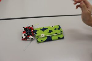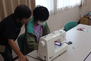 今回は精神保健ボランティアハートみよしの大西和子氏、大西澄子氏にご協力していただき「あまり布で作る小物入れ」を作成しました。ミシンを使うのは初めてと心配される方もいましたがミシンの使い方の説明を受けると縫い目をまっすぐ縫う事ができました。可愛い柄の布を沢山用意してくださっていたので皆さん自分好みの布をわくわくしながら選んでいました。自分の気に入った模様で作った小物は格別ですね♡!!